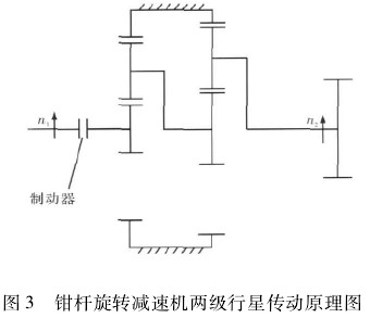 鉗桿旋轉(zhuǎn)減速機由液壓馬達(dá)直接驅(qū)動,由摩擦片式停車制動器,兩級或三級 NGW 型行星齒輪傳動機構(gòu)和輸出小齒輪組成。減速機通過螺栓連接在操作機機架上。鉗桿旋轉(zhuǎn)減速機帶載頻繁起動和制動,頻繁正反向旋轉(zhuǎn),工況非常惡劣。鉗桿旋轉(zhuǎn)減速機兩級行星傳動原理如圖 3 所示。