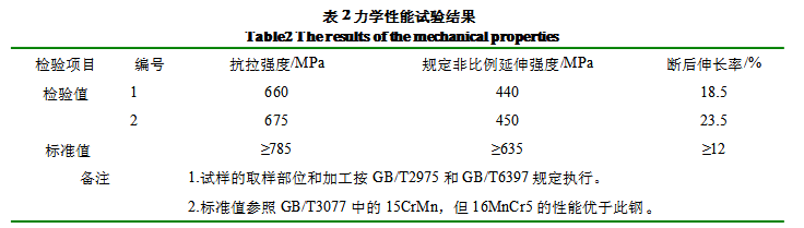 該輸出軸的化學(xué)成分檢驗(yàn)結(jié)果顯示,除元素Mn含量略低于EN10084-1998中的規(guī)定值外,其他元素均符合EN10084-2008中規(guī)定的要求。