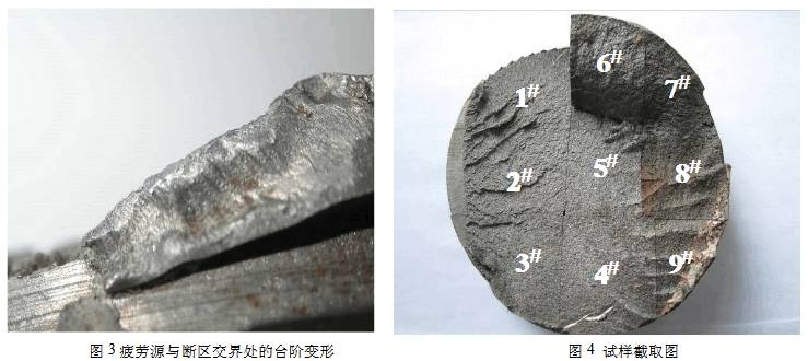 斷口微觀結(jié)果顯示,疲勞源由機(jī)加工刀痕而起,并由此擴(kuò)展;終斷區(qū)組織為準(zhǔn)解理沿晶的脆性斷裂組織。