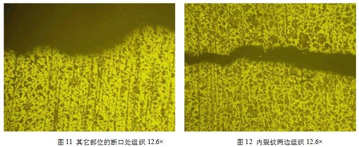 內(nèi)裂紋多為沿晶和穿晶裂紋,裂紋兩邊局部的組織晶粒度稍有差異(見圖12)。